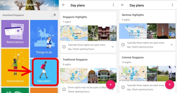 Day plans ตารางวางแผนบันทึกในการเที่ยวในแต่ละวัน หากคุณไม่เคยเที่ยวมาก่อน สามารถเลือกรูปแบบโปรแกรมเที่ยวตามที่ Google ได้แนะนำไว้ให้ หรือไม่ก็จัดรูปแบบการเที่ยวด้วยตัวเองได้เลย