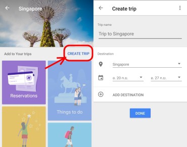 หากอยากสร้างทริปใหม่ก็ลองพิมพ์สถานที่ปลายทาง แล้วสร้างทริปเลย เช่นวางแผนไปสิงคโปร์ปลานปี ก็พิมพ์ Singapore ไป ซึ่งจะขึ้นหน้าจอหลักดังภาพบน แล้วแตะที่ Create Trip แล้วกำหนดชื่อทริป และระบุเวลาจัดทริปกันได้เลย