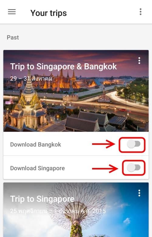 แม้ไม่มีเน็ต ไม่มี Wi-Fi ก็ไม่ใช่ปัญหา เพราะคุณสามารถดาวน์โหลดแผนที่ลงบน smartphone แบบ offline แค่เลื่อนสวิตซ์ ON ตามรูปเท่านั้น แล้วคุณก็สามารถใช้งานแอป Google Trips ได้สบายโดยไม่ต้องใช้เน็ต