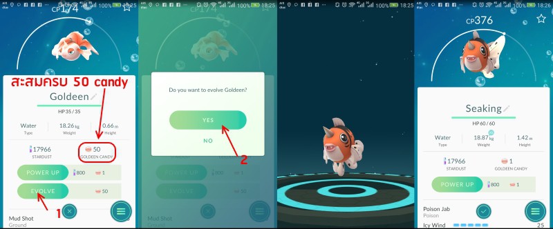 เมื่อสะสม Candy ของ Goldeen ครบ 50 เม็ดแล้ว สามารถแตะปุ่ม Evolve เพื่อพัฒนาร่างโปเกม่อน Goldeen ได้เลยแค่นี้ก็ได้โปเกม่อน ( Pokemon ) ร่างใหม่แล้ว หากไม่มีในฐานข้อมูล Pokedex ก็จะเพิ่มลงใน Pokedex พร้อมค่าประสบการณ์ สูงขึ้นด้วย
