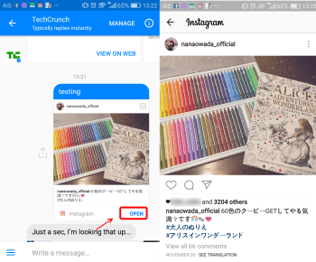 เพียงเท่านี้ก็เรียบร้อย เพื่อนๆที่เป็นผู้รับภาพจะได้รับเป็นภาพ instagram บนแอป Messenger แล้ว โดยมีระบุชื่อเจ้าของภาพและคำบรรยาย และสามารถแตะ open บริเวณแถบไอคอน instagram ด้านล่าง ก็จะทำการเปิดแอป Instagram และไปดูภาพอื่นๆจากผู้โพสต์และสามารถคอมเม้นต์ไปยังเจ้าของภาพได้ด้วย