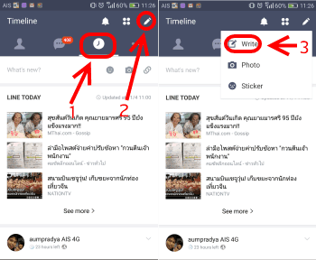 เริ่มจากเปิดแอป LINE เข้าไปที่แท็บ Timeline ( ไอคอนนาฬิกา) จากนั้นเลือกไอคอนปากกา แล้วเลือก Write เพื่อเขียนโพสต์ไทม์ไลน์