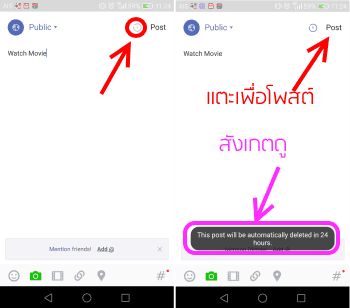 จากนั้นก็พิมพ์ข้อความโพสต์ปกติ จะแปะสติ๊กเกอร์ หรือแนบรูปภาพก็ได้ พอเขียนข้อความเสร็จก็ ให้แตะที่ไอคอนนาฬิกา(ที่อยู่ก่อน ปุ่ม Post ) เพื่อเปิดฟีเจอร์ลบโพสต์บนไทม์ไลน์ ( Timeline )อัตโนมัติภายใน 24 ชั่วโมง ซึ่งจะปรากฎข้อความตามลูกศรสีชมพูชี้นี้ว่าเปิดแล้ว สุดท้ายก็แตะปุ่ม POST เป็นอันเสร็จเรียบร้อย