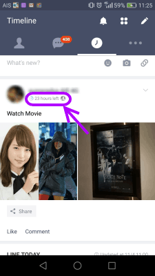สังเกตตอนหลังโพสต์ จะแสดงให้ดูว่าโพสต์ไทม์ไลน์ ( Timeline ) ของเรามีการนับถอยหลังว่าอีกกี่ชั่วโมงโพสต์นี้จะถูกลบ ใครที่ใช้แอป LINE อยู่สามารถทดลองฟีเจอร์นี้ได้
