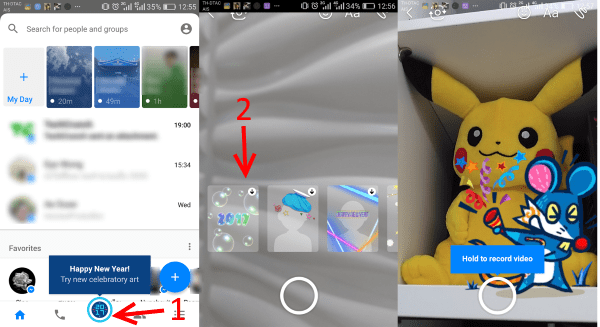 ให้แตะปุ่มไอคอนที่มี 2017 เพื่อเข้าสู่ Messenger Day ซึ่งคราวนี้มีสติ๊กเกอร์และลูกเล่นต่างๆที่น่าใช้มากมาย ออกแบบสำหรับทั้งถ่ายวิว และถ่าย Selfie ด้วย หากเลือกแบบสติ๊กเกอร์สำหรับการถ่าย selfie (ที่มีรูปเงาคน) จะมีลูกเล่นพิเศษด้วยนะลองใช้ดูได้เลย
