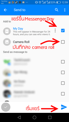 คุณสามารถแชร์วีดีโอนี้เห็นเฉพาะเพื่อนๆบางคนทางด้านล่าง หรือให้เพื่อนๆทุกคนเห็นได้เลยผ่านทาง My Day พร้อมกับ เลือก Camera Roll เพื่อเก็บวีดีโอนี้บน Camera Roll ได้