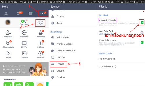 อีกวิธีนึงคือ ท่านสามารถสั่งไม่ให้ทำการ sync รายชื่อบนมือถือเราเข้ากับ LINE ได้ โดยเปิดแอป LINE แล้วเข้าที่แท็บ More เลือก Settings >> เลือก friends >> แล้วเอาเครื่องหมายถูกออกที่ Auto Add Friends