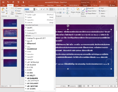 เท่านี้ก็เรียบร้อย ทุกสไลด์ที่มีแบบ font ที่เลือก Lily UPC ก็ถูกเปลี่ยนแบบ Font มาเป็น Angsana New ทุกหน้าแล้ว