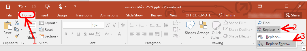แต่ถ้าต้องการเปลี่ยนแบบ Font นี้ทุกหน้าสไลด์ จาก Lily UPC มาเป็น Angsana new ทั้งหมดละก็ ง่ายๆ ไปที่แถบเครื่องมือ แท็บ Home เลือกที่ไอคอนสามเหลี่ยมของปุ่ม Replace เลือก Replace Fonts ดังรูป