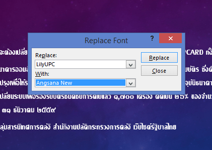 - คราวนี้ในส่วน With ให้เลือกว่า เปลี่ยนเป็นแบบ font อะไร ในตัวอย่างนี้เลือก Angsana New เพื่อต้องการให้แบบอักษรที่เคยใช้แบบ Lily UPC ให้เปลี่ยนมาเป็น Angsana New ทุกสไลด์