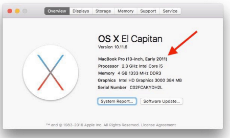 โดยคุณสามารถตรวจสอบชี่อรุ่นของเครื่อง Mac ที่คุณใช้อยู่ โดยคลิกไอคอน Apple บริเวณมุมซ้ายบน แล้วคลิกที่ About This Mac ตรงใต้ชื่อ OS จะมีระบุชื่อรุ่นและปีอยู่