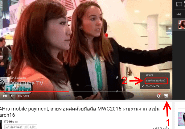 ส่วนวิธียกเลิกและให้เล่นวีดีโอนี้บนเครื่องคอมตามเดิมก็ แตะท่ไอคอนตามหมายเลข 1 แล้วเลือกที่ คอมพิวเตอร์เครื่องนี้ วีดีโอ Youtube ก็จะยกเลิกแสดงบนทีวี มาแสดงบนคอมของเราแทน