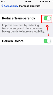 เพื่อลดความโปร่งแสง พื้นจะทึบเป็นสีเทา มองเห็นตัวหนังสือชัดขึ้น และช่วยประหยัดแบตเตอรี่มากขึ้น เพราะใช้ความสว่างที่น้อยลงจากการเปิด Reduce Transparency โดยเข้าไปที่ Settings > General >Accessibility > Increase Contrast >> เลือก Reduce Transparency >>แล้วเลือกให้เป็น ON