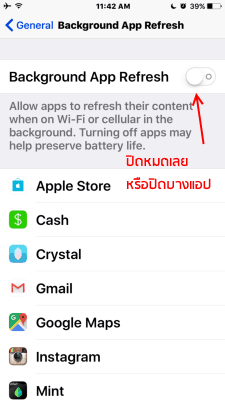 โดยไปที่ Settings >> General >> Background App Refresh แล้วปิดแอปที่ทำงานอยู่เบื้องหลัง เพื่อลดการรันแอปบน Smartphone ซึ่งจะทำให้ทำงานเร็วขึ้น และลดการใช้พลังงานแบตด้วย