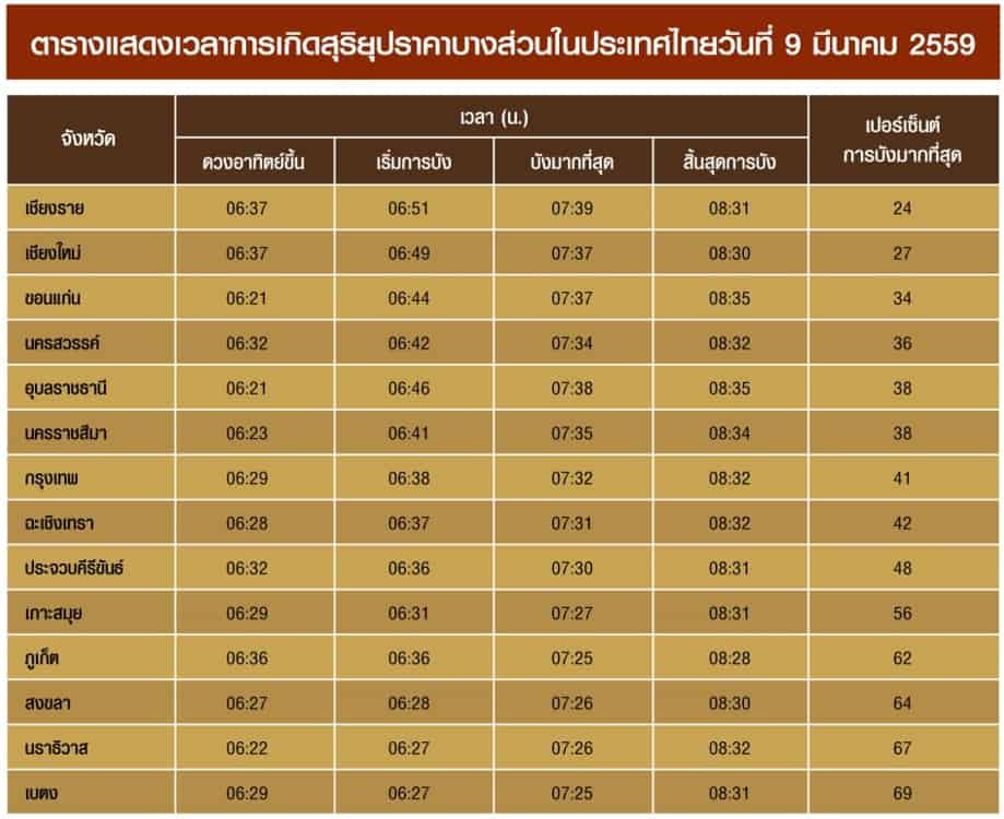 สถาบันวิจัยดาราศาสตร์แห่งชาติ (องค์การมหาชน)(สดร.) ชวนทุกท่านอย่าพลาดที่จะชมสุริยุปราคาบางส่วน ในช่วงเช้าตรู่พุธที่ 9 มีนาคม 2559 หากพลาดแล้วต้องรออีกทีสามปีข้างหน้า