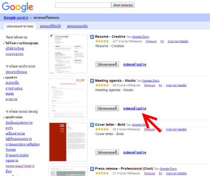 ก็จะมีเทมเพลต ( template ) จาก Google Docs หลากหลายรูปแบบให้เลือก ซึ่งใช้ได้ทั้งบน docs , sheet , slide สามารถเลือกได้ตามใจชอบ หากไม่แน่ใจก็ลองคลิกที่ แสดงตัวอย่าง เพื่อดูว่าเทมเพลตนี้ เหมาะมาใช้กับเอกสารของเรามั้ย?