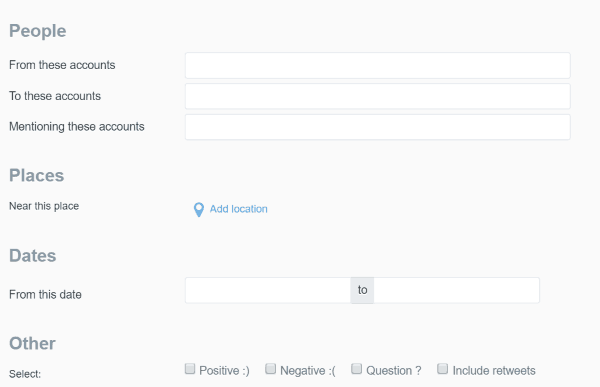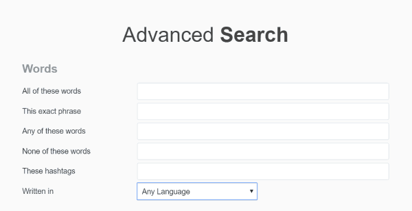 มาในส่วน Advanced Search เป็นการค้นหาขั้นสูงของเว็บไซต์ twitter.com โดยมีช่องให้กรอก ในการช่วยกรองการค้นหาบน twitter ให้ตรงตามต้องการ โดยแบ่งเป็น 5 ส่วนคือ