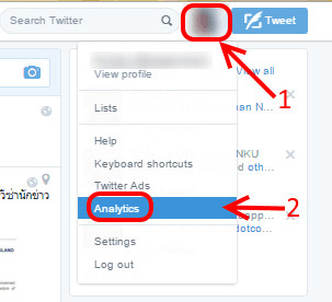 เริ่มต้นจากเข้าเว็บไซต์ twitter.com ทำการ Sign in ให้เรียบร้อย จากนั้นคลิกที่ไอคอนโปรไฟล์เราบริเวณมุมขวาบนของเว็บไซต์ twitter แล้วเลือกที่ Analytics ดังรูป (หรืออีกช่องทางนึงคือเข้าที่เว็บไซต์ analytics.twitter.com แล้วทำการ sign in ด้วบบัญชี twitter ได้เช่นกัน)