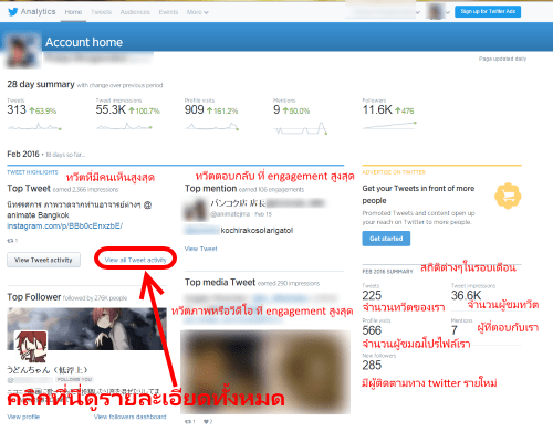ก็จะเข้าสู่หน้าหลักของ twitter analytic ซึ่งจะเผยข้อมูลสถิติต่างๆที่สำคัญๆดังรูปด้านบนแบ่งแยกเป็นรายเดือนได้อย่างชัดเจน คราวนี้ลองคลิกที่ View all Tweet activity เพื่อดูรายละเอียดทั้งหมด