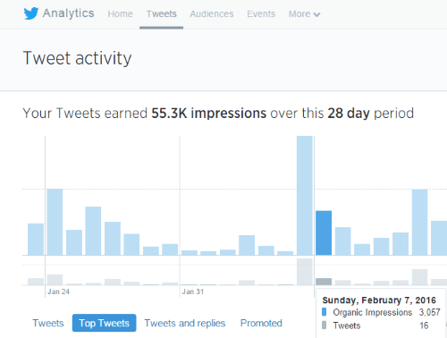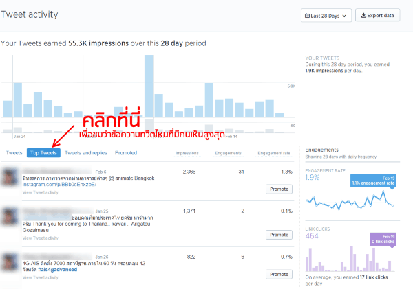 ก็จะเห็นกราฟการทวีตในช่วง 28 วันที่ผ่านมา และด้านล่างจะเป็นข้อความทวีตที่เราได้โพสต์ทวีตเอง ซึ่งมาพร้อมกับจำนวนคนอ่านทวีต ค่า Engagement และคะแนน Engagement rate คิดเป็นเปอร์เซ็นต์ ซึ่งหากคุณคลิกที่ top tweets จะพบข้อความที่มีผู้ชมคลิกอ่านทวีตข้อความเราสูงสุดให้เห็นดังภาพนี้ โดยปัจจัยที่ทำให้ค่า Engegement สูงนั้นก็ขึ้นอยู่กับจำนวน follower , การใช้ hashtag ตลอดจนมีผู้ติดตามกดปุ่ม retweet ข้อความของเราเพื่อแชร์ต่อให้คนอื่นๆเห็น ทำให้คนอื่นเห็นข้อความโพสต์จำนวนมาก + มีคน Like เยอะ ทำให้ค่า engage สูง