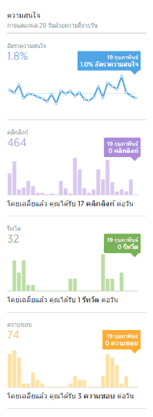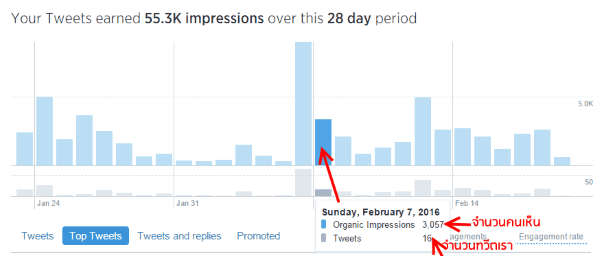 กราฟด้านบนเป็นการดูจำนวนคนที่สนใจทวีตของคุณว่าคุณทวีตกี่ครั้ง แล้วมีคนดูของเรามากน้อยแค่ไหน