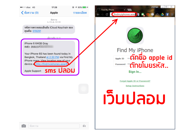 มีการแชร์ต่อจากทางเพจบน facebook มีเรื่องราวอยู่ว่า เมื่อ 16/07/59 หนุ่มสาวคู่หนึ่งไปจตุจักร ถูกล้วงกระเป๋า โทรศัพท์ของแฟนหายไป เลยเข้าไปแอป Find My iPhone เพื่อตามหาโทรศัพท์แต่ออฟไลน์อยู่ พอเวลา2ทุ่ม เครื่องแจ้งเตือนว่าเครื่องที่ถูกขโมยนั้นอยู่ศรีนครินทร์ เลยไปแจ้งความที่สน.บางซื่อ เพื่อขอใบตราครุฑและไปยืนที่เครือข่าย3ค่ายใหญ่ และได้รับ sms จาก apple ว่าโทรศัพท์เราใช้งานอีกครั้งที่กรุงเทพ เลยกดเข้าไปในลิงค์เพื่อกรอกรหัส icloud และเข้าไปกับไม่มีอะไรเลย.. และดันทำให้เครื่องที่ถูกบัญชีไปจาก find my iphone วันที่20/07/59 เลยเข้าไปถามเรื่องการตามหาเครื่องที่ istudio และได้เล่าเรื่องราวให้พี่ผลปรากฏว่า apple ไม่มีการส่ง sms แต่ที่เราได้รับ sms มันเป็นโปรแกรมของพวกมิจฉาชีพที่ทำขึ้น เพื่อให้เราใส่รหัส icloud และปลดล็อคเอาเครื่องที่โจรขโมยได้นั้นออกจากการติดตาม