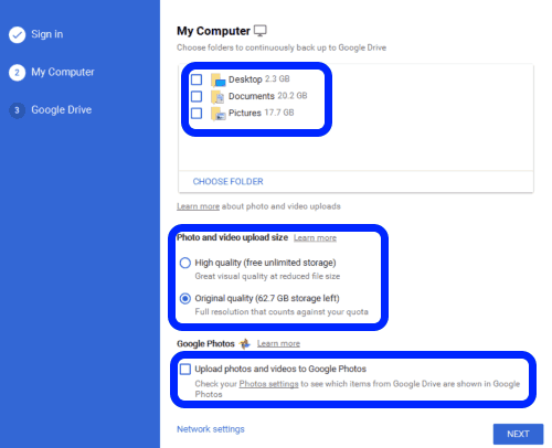 - ต่อมาเลือกรูปแบบการอัปโหลด เลือกระหว่าง High Quality ซึ่งจะเป็นการบีบอัดไฟล์ภาพและวีดีโอ และไม่ถูกคิดพื้นที่การใช้งานบน Google Drive หรือจะเลือก Original Quality เพื่อไม่บีบอัดภาพและวีดีโอแต่จะถูกคิดการใช้พื้นที่บน Google Drive เลือกได้ตามต้องการ