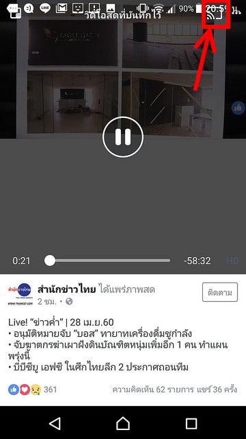 จากนั้นแตะให้เห็นส่วนควบคุมของ facebook จะเห็นไอคอน Cast อยู่บริเวณมุมขวาบนของจอ