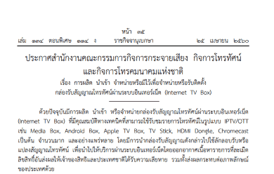 กสทช. ออกประกาศกำหนดเรื่อง การผลิต, นำเข้า การจำหน่าย “กล่องรับสัญญาณโทรทัศน์ผ่านระบบอินเทอร์เน็ต” (Internet TV Box) ที่มีคุณสมบัติชม IPTV/OTT ทั้ง Chromecast , Apple TV , Android box , Media Box , HDMI DONGLE ต้องขออนุญาตนำเข้าตามมาตรา 70 แห่งพ.ร.บ.การประกอบกิจการกระจายเสียงและกิจการโทรทัศน์ ไม่ว่ากล่องเหล่านี้จะติดตั้งแอปพลิเคชั่นสำหรับรับสัญญาณโทรทัศน์อยู่ก่อนแล้วหรือไม่ก็ต้องขออนุญาตทั้งสิ้น