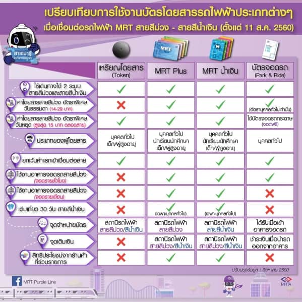 จากภาพนี้เห็นว่าทั้งเหรียญโดยสารและบัตรรถไฟฟ้า MRT จะสามารถใช้เดินทางได้ทั้ง 2 สายคือสายสีน้ำเงินและสายสีม่วง แต่บัตรรถไฟฟ้า MRT จะได้อัตราพิเศษในช่วงวันหยุด และสามารถเติมเที่ยว 30 วันได้ ซึ่งเหรียญโดยสารกลมๆจะไม่ได้ส่วนลด และใช้โดยสารได้เพียงเที่ยวเดียว ตามตารางนี้