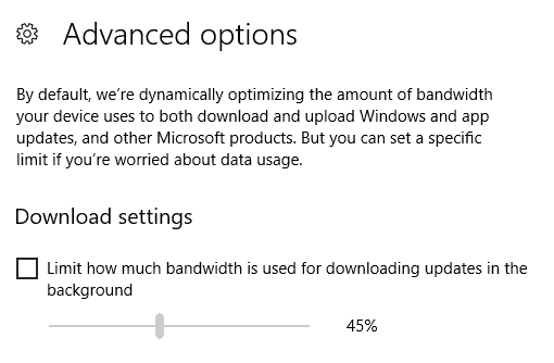 โดยเข้าไปที่ Settings > Update & Security > Windows Update > Update Settings > Advanced Options > Delivery Optimization > Advanced Settings. แล้วติ๊กเครื่องหมายถูกตามด้านบน และปรับลดการใช้แบรนด์วิธให้เหลือน้อยๆ