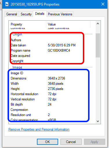 ก็จะแสดงข้อมูลรูปภาพแล้ว โดยส่วนแรกที่สำคัญก็คือ Origin ว่าไฟล์นี้หรือภาพนี้ถ่ายขึ้นเมื่อไหร่ ซึ่งสำคัญสุดว่าภาพนี้ถูกถ่ายขึ้น ณ วันและเวลานี้ ส่วนหมวด Image นั้นก็คือข้อมูลทั่วไปเกี่ยวกับรูปภาพ ทั้งขนาดภาพและความละเอียดของภาพ dpi