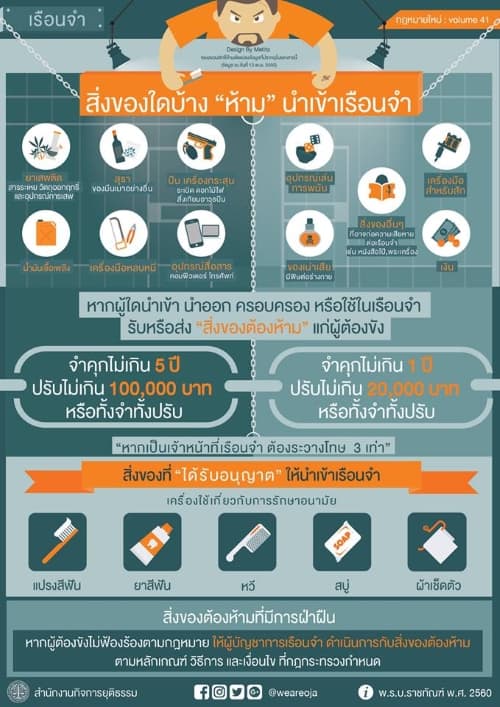 สำนักงานกิจการกิจการยุติธรรม ได้โพสภาพ Infographic เกี่ยวกับกฎหมายใหม่ว่า สิ่งใดบ้างที่ห้ามนำเข้าเรือนจำ โดยเฉพาะพวกอุปกรณ์อิเล็กทรอนิกส์ อุปกรณ์สื่อสารไอที มักเป็นอุปกรณ์ที่เกี่ยวข้องในการไม่ให้นำเข้าเรือนจำเป็นอันขาด หากเอาเข้ามีบทลงโทษหนักด้วย