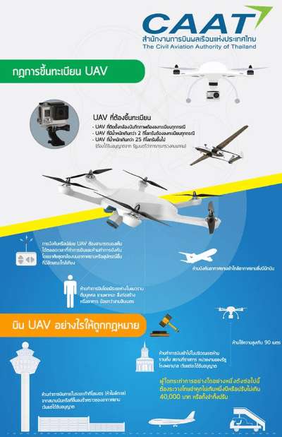 UAV อากาศยานไร้คนขับ หรือที่เรียกสั้นๆว่า โดรน ( Drone ) การที่จะได้ครอบครองและบินได้ถูกต้องตามกฎหมายไทยนั้น จะต้องขึ้นทะเบียน UAV จากสำนักงานการบินพลเรือนแห่งประเทศไทย CAAT ด้วย และต้องทราบกฎการบินว่าบินโดรนอย่างไร ไม่ให้ผิดกฎหมายด้วย ทางสำนักงานการบินพลเรือนแห่งประเทศไทย CAAT ได้โพสต์ Infographic ล่าสุดผ่านทาง facebook เพื่อชี้แจงต่อประชาชนที่มีโดรนครอบครองอยู่ ซึ่งนับวันราคาถูกและเป็นเจ้าของง่ายขึ้น แต่หลายท่านไม่ทราบกฎการบินเลย