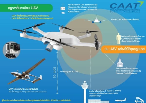 สำนักงานการบินพลเรือนแห่งประเทศไทย CAAT ได้โพสต์ภาพ Infographic เกี่ยวกับ กฎหมายน่ารู้เกี่ยวกับโดรน Unmanned Aerial Vehicle (UAV) และ กฎการขึ้นทะเบียนโดรน Unmanned Aerial Vehicle (UAV) เพื่ออธิบายและเข้าใจง่ายขึ้น โดยรายละเอียดข้อกฎหมายการใช้โดรนในไทยมีดังนี้