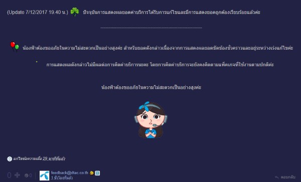 “ปัจจุบันพบปัญหาการคำนวนยอดผิดพลาด ทำให้ลูกค้าถูกระงับสัญญาน ยอดบางหมายเลข อาจผิดพลาด สำหรับปัญหาที่ได้แจ้งเข้ามานั้น ทางฝ่ายวิศวกรของเรา กำลังเร่งแก้ไขใอย่างเร่งด่วนที่สุดค่ะ ต้องขออภัยในความไม่สะดวกในการใช้งานค่ะ