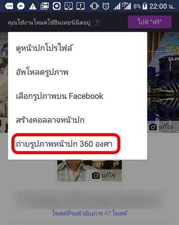 โดยเปิดแอป Facebook บน iOS หรือ Android จากนั้นเข้าโปรไฟล์ตัวเอง แล้วแตะที่รูป Cover Facebook เพื่อเปลี่ยนรูป เลือกที่ ถ่ายรูปภาพหน้าปก 360 องศา