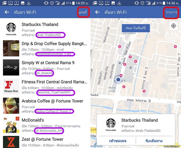 ก็จะหาสถานที่ที่มีให้บริการ Wi-Fi ฟรี ซึ่งส่วนใหญ่จะเป็นที่พัก สถานที่สาธารณะ และพวกร้านค้า ร้านอาหารในศูนย์การค้า และสามารถเปลี่ยนเป็นแสดงพิกัดให้บริการ Wi-Fi ในรูปแบบแผนที่ได้ด้วย
