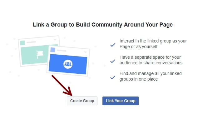 จากนั้นคลิกที่ Create Group ใหม่ สำหรับสร้างกลุ่มบน facebook ใหม่ หรือคลิกที่ Link Your Group สำหรับเชื่อมไปยังกลุ่มของตัวเองที่คุณได้รับเป็น Admin