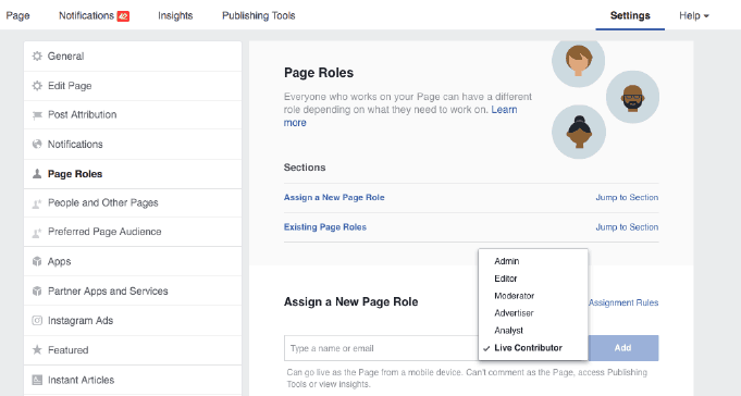 นอกจากนี้ facebook pages ยังสามารถตั้งค่ากำหนดทีมงานผู้ดูแล facebook pages ในการช่วย Live ได้ด้วย ผ่านทาง Manage tab >> Page Roles แล้วเพิ่มชื่อทีมงานแล้วเลือกที่ Live Contributor เพื่อเพิ่มทีมงาน Live ขึ้นเพจโดยเฉพาะได้
