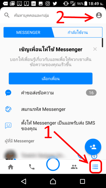 เริ่มจากเข้าไปที่แอป Messenger ( Facebook Messenger ) เมื่อเข้าหน้านี้ก็แตะไอคอนรายการ ตามหมายเลข 1 >> จากนั้นแตะที่ไอคอนรูปคน บริเวณมุมขวาบนของจอ