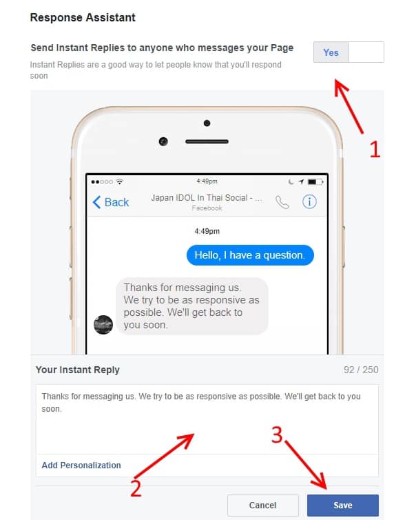 จากนั้นจะเห็นปุ่ม Change เกิดขึ้น คลิกที่ปุ่ม changes แล้วพิมพ์ข้อความตอบกลับอัตโนมัติ (ตามหมายเลข 2 ) ซึ่งจะตอบกลับกรณีมีคนส่งข้อความ inbox มายังเพจของเรา ดังนั้นคิดประโยคตอบกลับไปยังผู้ติดตามเพจดีๆ เสร็จแล้วคลิกปุ่ม save (ตามหมายเลข 3) แค่นี้ก็เรียบร้อย