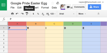 Google ร่วมเซอร์ไพรส์เดือน Pride Month ในปี 2017 ด้วย Easter Egg สูตรลับตาราง Spreadsheet ง่ายๆผ่านการพิมพ์ แต่ละช่องคำว่า PRIDE แบบดังรูปนี้ แล้วจะเป็นสีรุ้งนี้สวยๆออกมาทันที ทั้งนี้จะพิมพ์ Pride แบบอื่นที่ต่างจากด้านบนนี้จะเป้นสีปกติเหมือนเดิมโดย Pride Month ของสหรัฐอเมริกา จัดในช่วงเดือนมิถุนายนของทุกปี เป็นเดือนที่ให้ความสำคัญแก่ชาวเกย์และเลสเบี้ยน ซึ่งในช่วงวันอาทิตย์สุดท้ายของเดือนมิถุนายน ถูกกำหนดเป็นวัน Gay Pride Day โดยมีกิจกรรมเฉลิมฉลองยิ่งใหญ่ด้วยขบวนพาเหรดบนถนนสายหลักของมหานครนิวยอร์ก