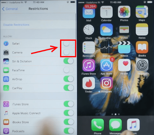 คราวนี้จะเห็นแอปทุกตัวบน iOS จะเป็นสวิตซ์สีเขียวแล้ว ลองปิดสวิตซ์ Safari และ Camera ซึ่งเป็นแอพหลักบน iOS ดู ปรากฏว่าแอป Safari และ Camera หายไป ซึ่งเฉลยคือไม่ได้หายไปไหน แต่ถูกซ่อนไว้เรียบร้อย ซึ่งพอมาเปิด ON ที่ Safari และ Camera ทั้ง 2 แอพนั้นก็จะกลับมาเหมือนเดิม