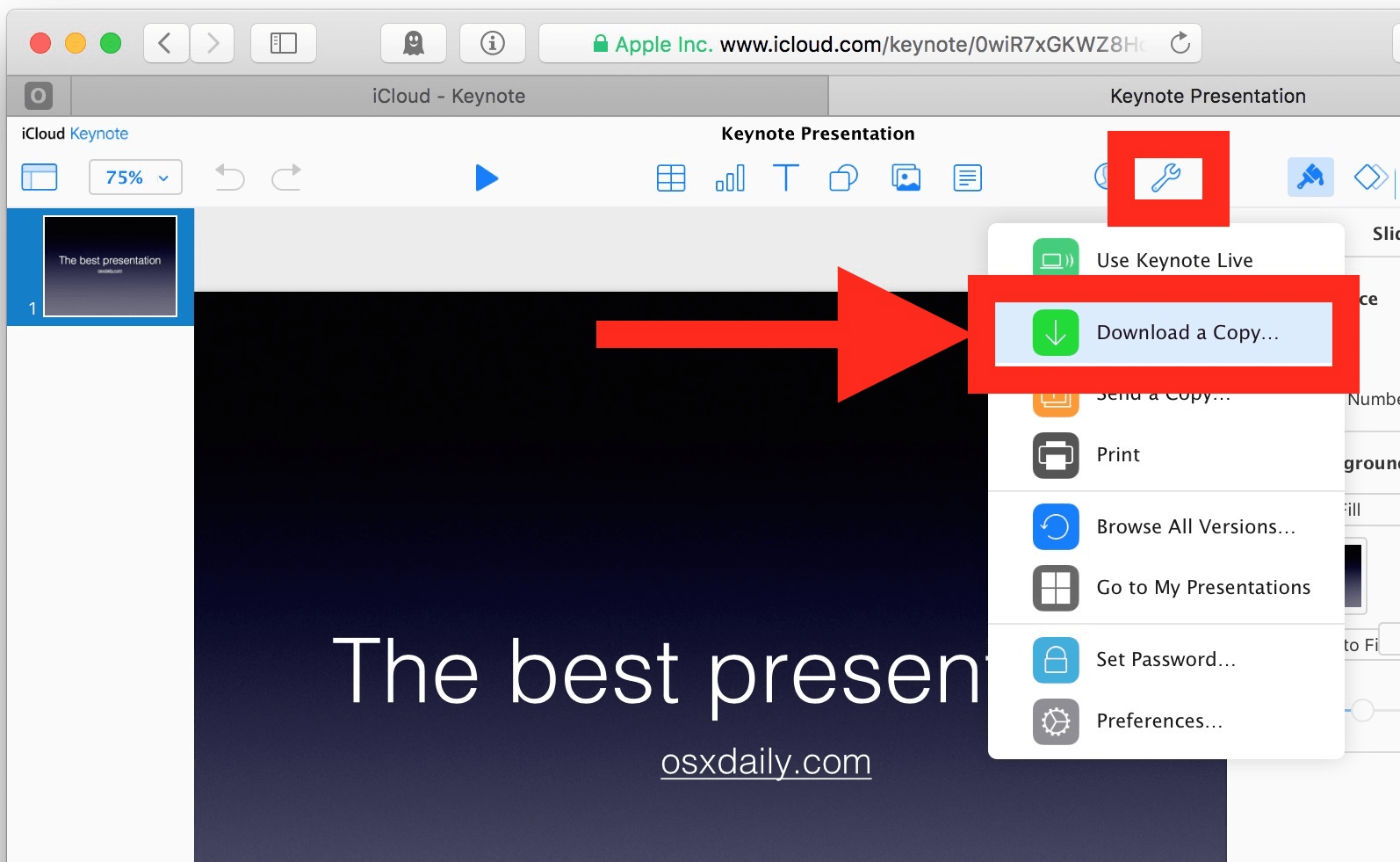 ก็จะดาวน์โหลดสไลด์ นั้นบน Keynote แปลงเป็นไฟล์ PowerPoint (.pptx) และดาวน์โหลดลงเครื่องให้เรียบร้อยเสร็จแล้ว