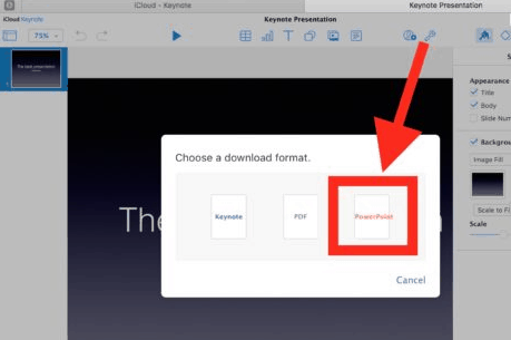 แล้วเลือกรูปแบบการดาวน์โหลด จะมีให้เลือก 3 ตัวเลือกคือ Keynote , PDF และ PowerPoint ก็เลือกสกุลไฟล์ที่ต้องการได้เลย ในตัวอย่างนี้เลือก PowerPoint เพื่อแปลงไฟล์จาก Keynote มาเป็น PowerPoint