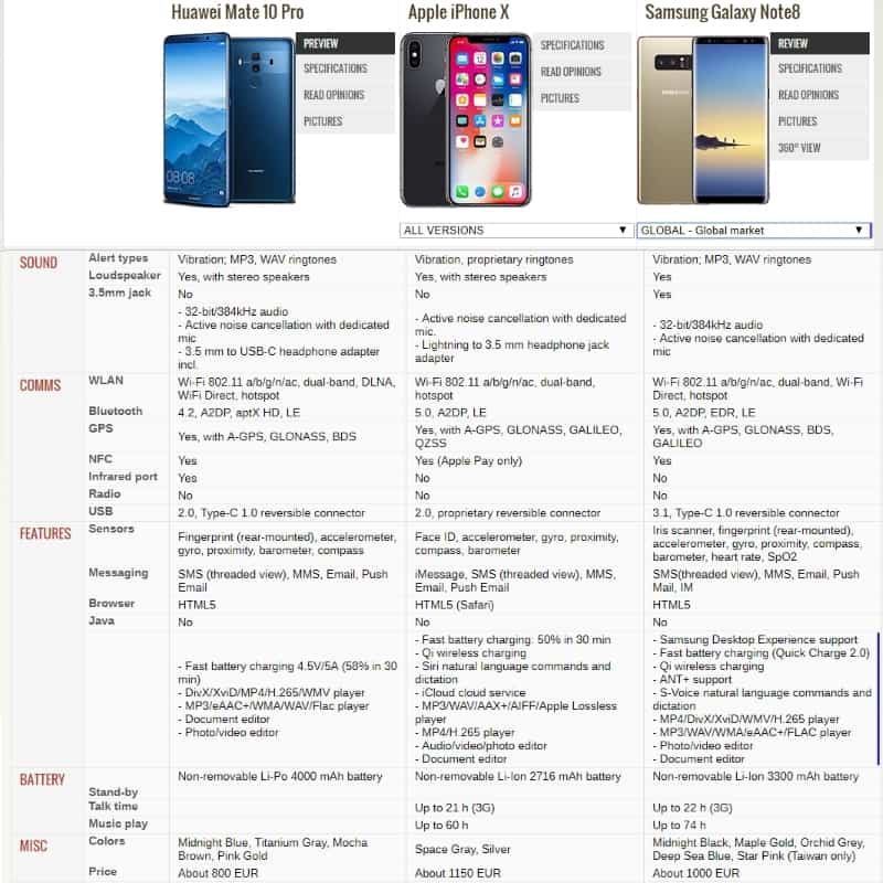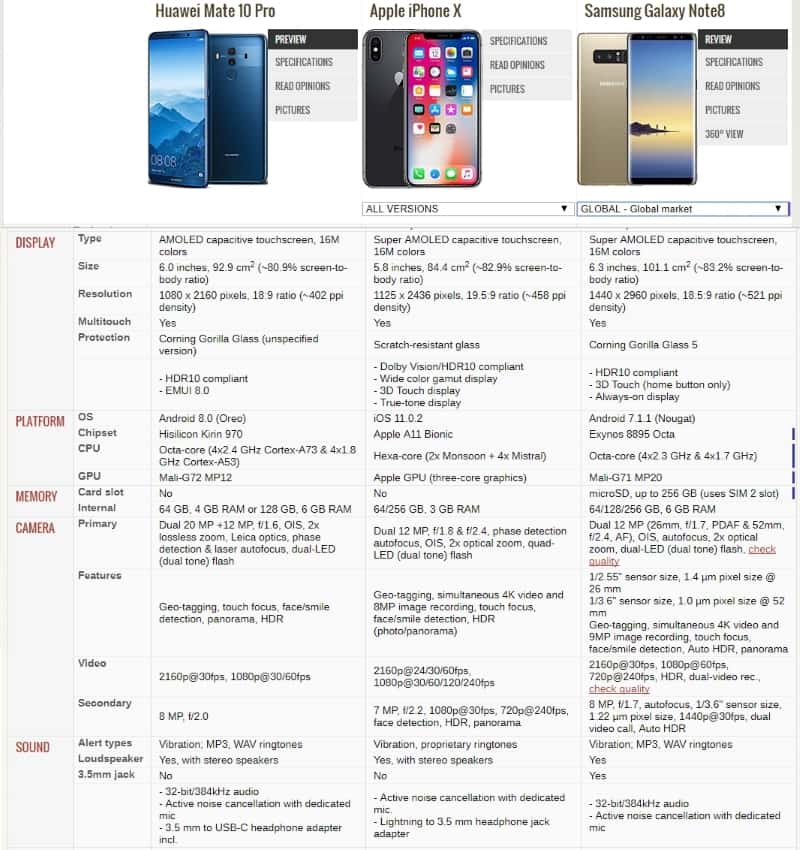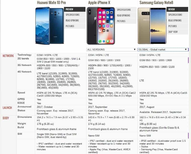 ในช่วงปลายปี 2017 สมาร์ทโฟนเรือธงก็เผยโฉมมาแล้วถึง 3 รุ่น อย่าง Huawei Mate 10 Pro , Apple iPhone X และ Samsung Galaxy Note 8 หากไม่รวม Google Pixel 2 จะเห็นได้ว่าสเปคใกล้เคียง แต่ก็มีความต่างบ้าง ในราคาที่ใกล้เคียงกันเริ่มต้นราว 2 หมื่นปลายๆ – 3 หมื่นกว่าบาท นี้ เราเลยมาลองเทียบสเปคกันทั้งในเรื่องสเปคแบบละเอียดความเหมือนและความต่าง และความสามารถที่เป็นจุดเด่นของแต่ละรุ่นด้วย