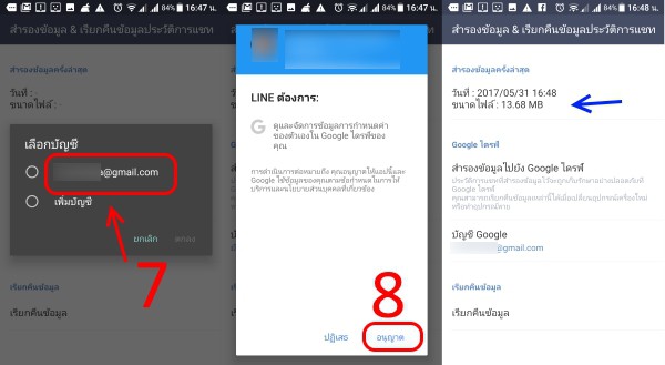 หากคุณใช้ Apple ให้ใส่บัญชี Google พร้อมรหัสผ่าน ส่วน ผู้ใช้ Android ซึ่งใช้บัญชี Google อยู่แล้ว เลือกบัญชี Google ของคุณที่จะเข้าถึง Google Drive >> จากนั้นเลือกที่อนุญาต เสร็จแล้วรอสักครู่ เพื่อซิงค์ข้อมูลขึ้น Google Drive หากเสร็จเรียบร้อยจะขึ้นสำรองข้อมูลครั้งล่าสุด พร้อมระบุขนาดไฟล์ที่ Backup ไว้เรียบร้อย เป็นการเสร็จสิ้นการ Backup ประวัติการแชท