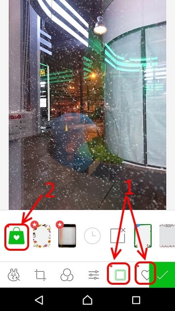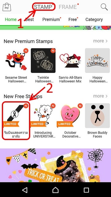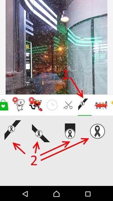 เวลาใช้งานให้ แตะที่ไอคอนรูปหัวใจ แล้วเลือกริบบิ้นสีดำ ตามสัญลักษณ์หมายเลข 1 แล้วเลือกรูปแบบตามต้องการ