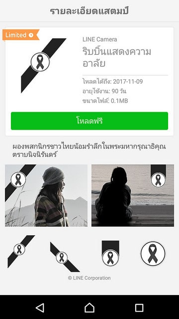 แอป LINE Camera แอปแต่งภาพใส่แสตมป์สติ๊กเกอร์ประดับรูปน่ารักๆ ได้ออกแสตมป์ลายพิเศษรูปโบว์สีดำ หรือริบบิ้นสีดำสำหรับร่วมแสดงความอาลัยแด่พระบาทสมเด็จพระปรมินทรมหาภูมิพลอดุลยเดช ผู้ใช้สามารถสร้างรูปโปรไฟล์โดยใช้สแตมป์แต่งภาพ ชุด “ริบบิ้นแสดงความไว้อาลัย” สามารถเข้าไปดาวน์โหลดได้ที่ http://lin.ee/7uNWwn2 ได้จนถึงวันที่ 9 พฤศจิกายน 2560